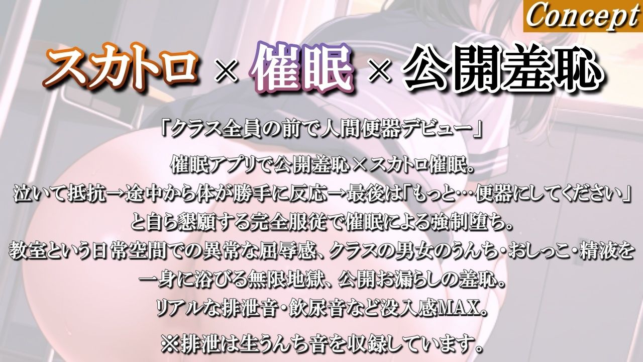 放課後の教室が、一瞬にして逃げ場のない「公衆便器」へと変貌する……。ごく普通の真面目なJKが、クラスメイトの悪戯で手にした「催眠アプリ」の餌食となり、全生徒の前で人間としての尊厳を完膚なきまでに破壊される、超弩級のスカトロ×催眠×公開羞恥ボイスが登場だ!