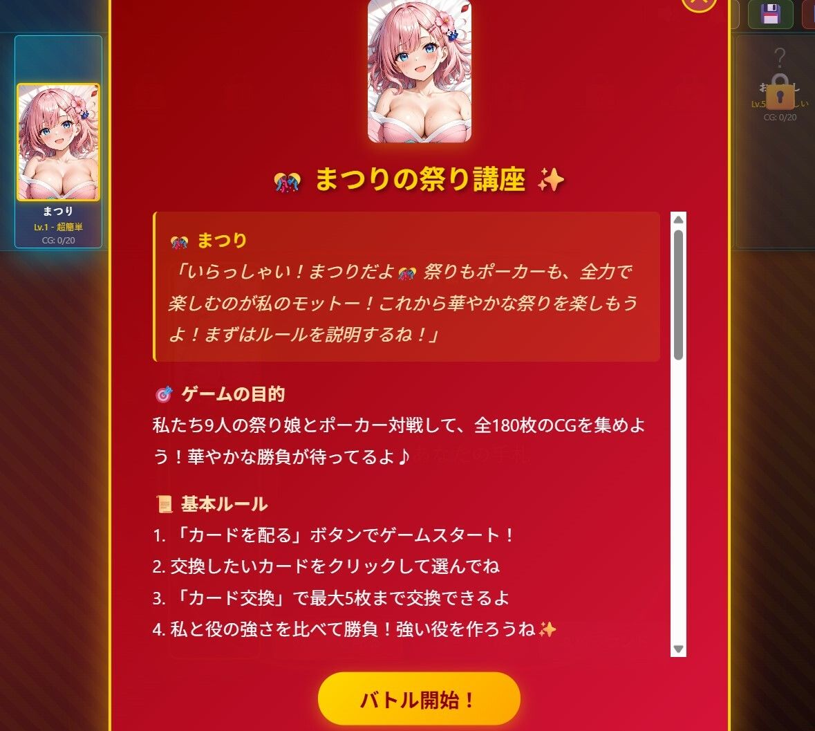 お祭り騒ぎの準備はいいか!?今夜、君の運命を左右する最高のカードゲーム『祭りポーカーガールコレクション』がついに開幕だ!